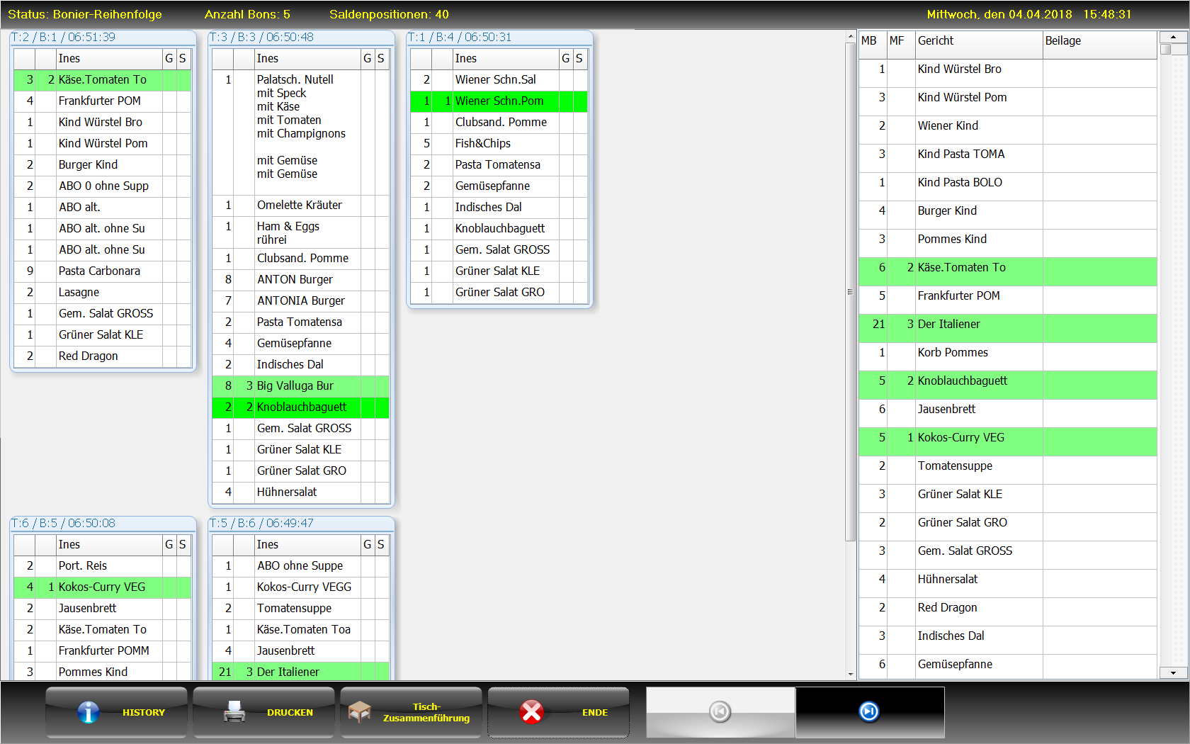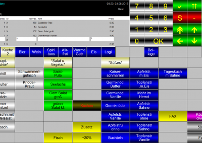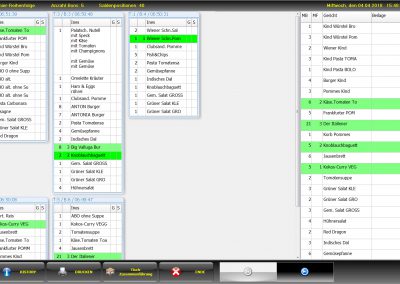 alle Bons erscheinen konzentriert und übersichtlich (inkl. Beilagenänderungen) an einem Touchbildschirm (wenn gewünscht noch zusätzlich an einem großen Bildschirm, welcher für die ganze Küchenbelegschaft einsehbar ist).